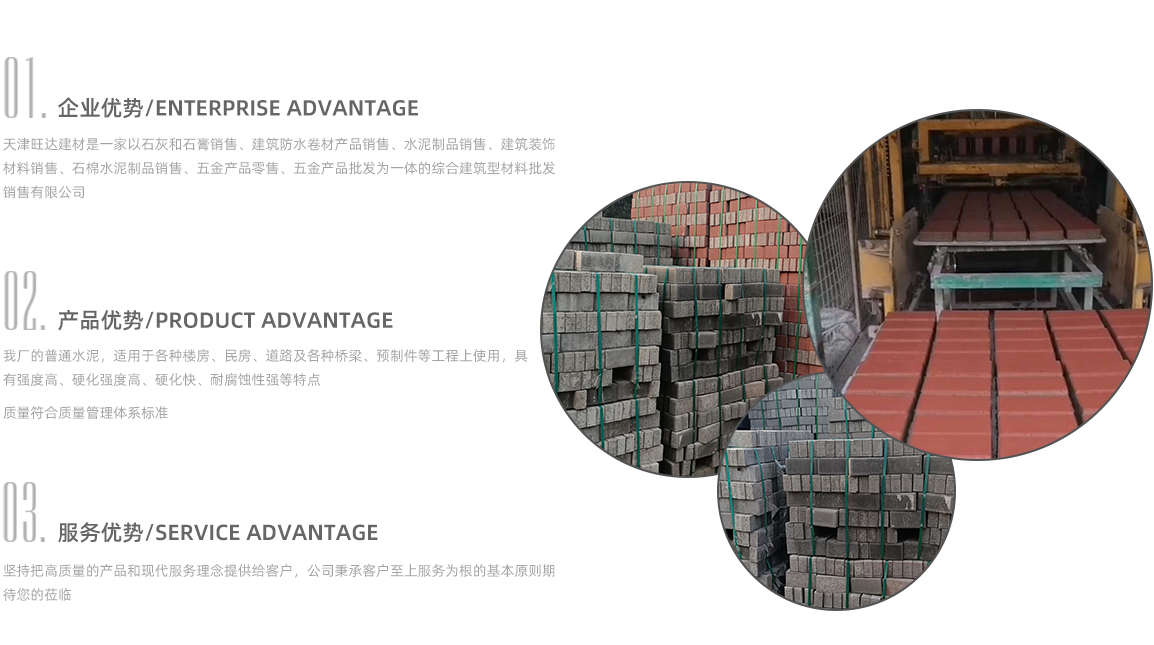 天津旺達(dá)建材是一家以沙子,水泥,加氣塊,加氣磚,面包磚,石灰和石膏銷售;建筑防水卷材產(chǎn)品銷售;建筑裝飾材料銷售;石棉水泥制品銷售;五金產(chǎn)品零售;五金產(chǎn)品批發(fā)為一體的綜合建筑型材料批發(fā)銷售有限公司,公司秉承客戶至上服務(wù)為根的基本原則期待您的蒞臨。作為專頁的建材生產(chǎn)企業(yè),我們?yōu)槟峁﹥?yōu)良的天津沙子、天津水泥和天津面包磚,肯定能滿足您對(duì)建筑材料的需求。我們天津沙子廠家的沙子粒度均勻,適用于各類建筑項(xiàng)目,從住宅到大型商業(yè)工程,都能確保工程質(zhì)量的堅(jiān)固與耐用。我們天津水泥廠家生產(chǎn)的高強(qiáng)度水泥,經(jīng)過嚴(yán)格的質(zhì)量控制,不僅具備很強(qiáng)的粘合力,還擁有優(yōu)異的耐久性,能夠適應(yīng)各種復(fù)雜的施工環(huán)境,保障建筑結(jié)構(gòu)的穩(wěn)固。我們天津面包磚廠家生產(chǎn)的面包磚系列更是以其美觀、環(huán)保、耐磨的特性,廣泛應(yīng)用于城市道路鋪設(shè)、園林景觀建設(shè)等項(xiàng)目,提供持久的美觀與功能性。我們堅(jiān)持綠色環(huán)保理念,所有產(chǎn)品均通過嚴(yán)格的環(huán)保檢測,力求為您提供相對(duì)高...